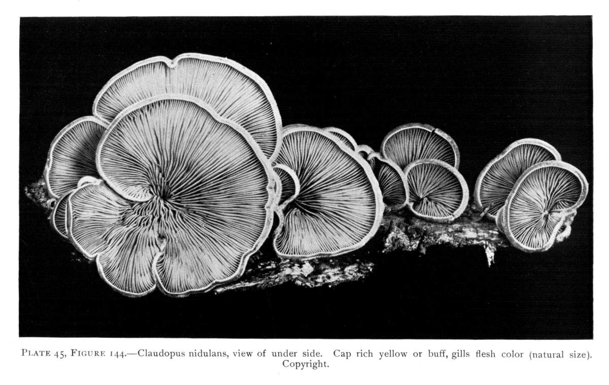 The Stem is Absent in Some Mushrooms.—There are also quite a large number of mushrooms which lack a stem. These usually grow on stumps, logs, or tree trunks, etc., and one side of the cap is attached directly to the wood on which the fungus is growing.[Pg 4] The pileus in such cases is lateral and shelving, that is, it stands out more or less like a shelf from the trunk or log, or in other cases is spread out flat on the surface of the wood. The shelving form is well shown in the beautiful Claudopus nidulans, sometimes called Pleurotus nidulans, and in other species of the genus Pleurotus, Crepidotus, etc. These plants will be described later, and no further description of the peculiarities in form of the mushrooms will be now attempted, since these will be best dealt with when discussing species fully under their appropriate genus. But the brief general description of form given above will be found useful merely as an introduction to the more detailed treatment. Chapter XXI should also be studied. For those who wish the use of a glossary, one is appended at the close of the book, dealing only with the more technical terms employed here.