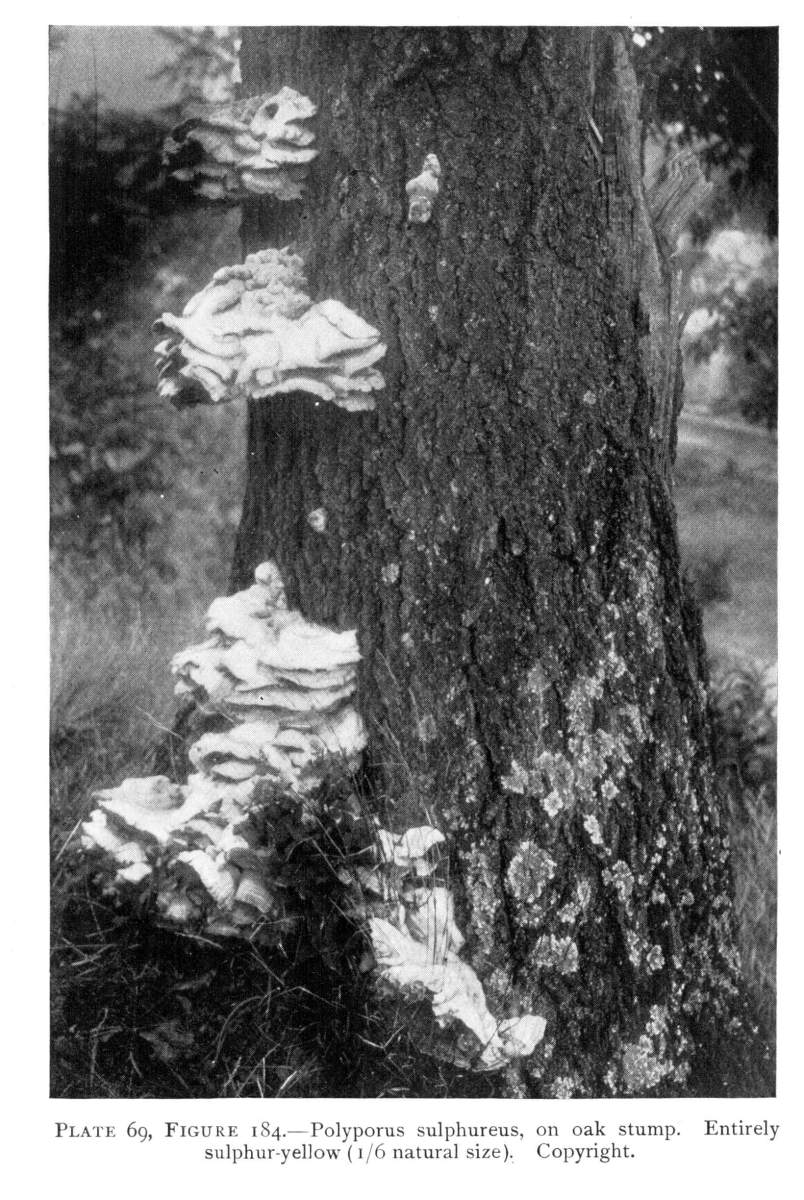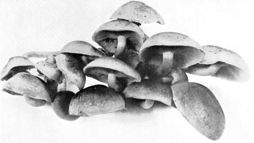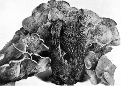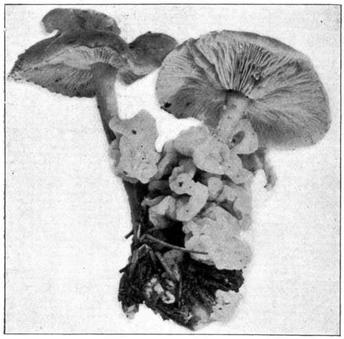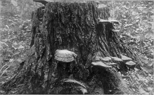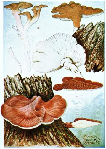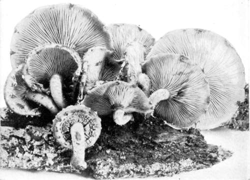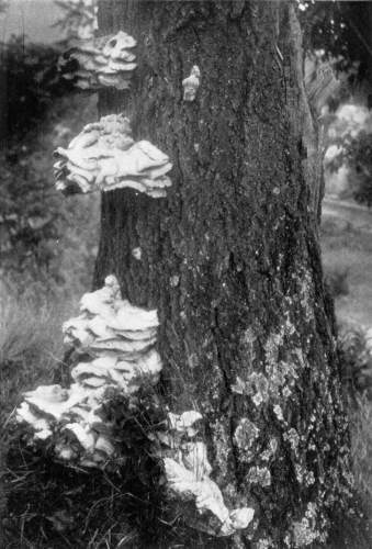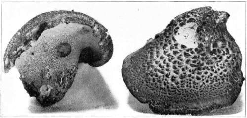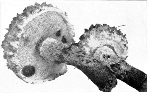 Wood Destroying Fungi.—Many of the mushrooms, and their kind, grow on wood. A visit to the damp forest during the summer months, or during the autumn, will reveal large numbers of these plants growing on logs, stumps, from buried roots or rotten wood, on standing dead trunks, or even on living trees. In the latter case the mushroom usually grows from some knothole or wound in the tree (Fig. 9). Many of the forms which appear on the trunks of dead or living trees are plants of tough or woody consistency. They are known as shelving or bracket fungi, or popularly as "fungoids" or "fungos." Both these latter words are very unfortunate and inappropriate. Many of these shelving or bracket fungi are perennial[Pg 10] and live from year to year. They may therefore be found during the winter as well as in the summer. The writer has found specimens over eighty years old. The shelves or brackets are the fruit bodies, and consist of the pileus with the fruiting surface below. The fruiting surface is either in the form of gills like Agaricus, or it is honey-combed, or spinous, or entirely smooth.