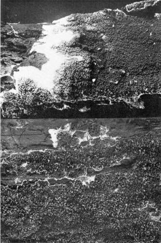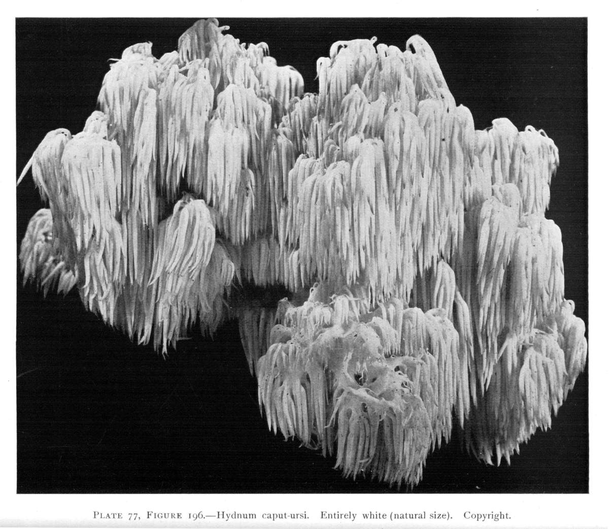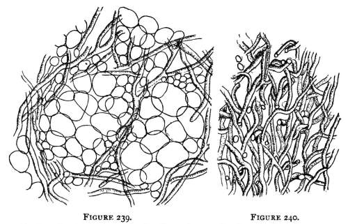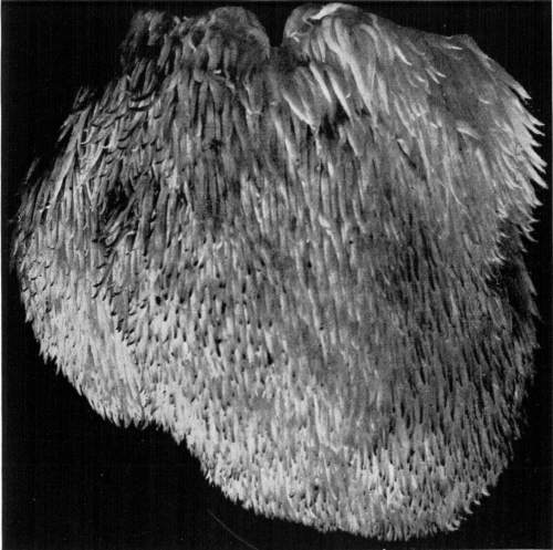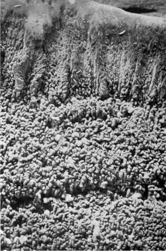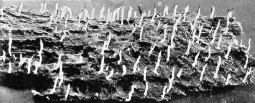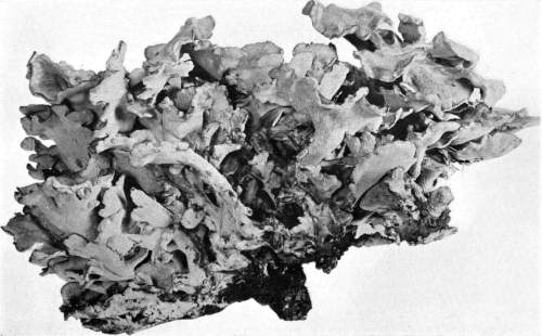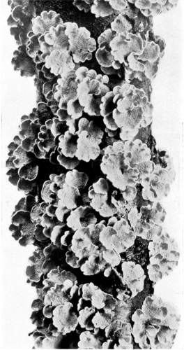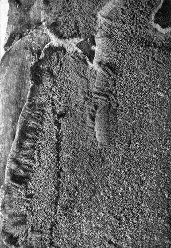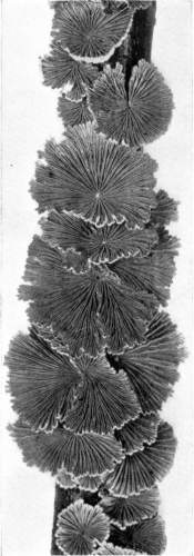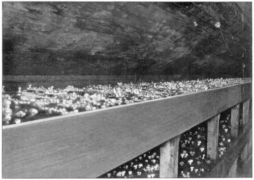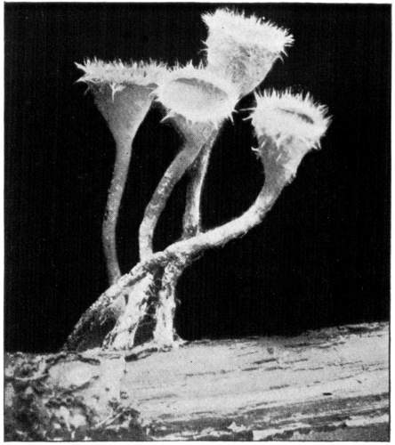 So one can understand how it is that deep down in these abandoned mines the mycelium grows profusely on the surface of doors and wood props. Figure 11 is from a flashlight photograph, taken by the writer, of a beautiful growth on the surface of one of the doors in an abandoned coal mine at Wilkesbarre, Pa., during September, 1896. The specimen covered an area eight by ten feet on the surface of the door. The illustration shows very well the habit of growth of the mycelium. At the right is the advancing zone of growth, marked by several fan-shaped areas. At the extreme edge of growth the mycelium presents a delicate fringe of the growing ends where the threads are interlaced uniformly over the entire area. But a little distance back from the edge, where the mycelium is older, the threads are growing in a different way. They are now uniting into definite strands. Still further back and covering the larger part of the sheet of mycelium lying on the surface of the door, are numerous long, delicate tassels hanging downward. These were formed by the attempt on the part of the mycelium at numerous places to develop strands at right angles to the surface of the door. There being nothing to support them in their attempted aerial flight,[Pg 12] they dangle downward in exquisite fashion. The mycelium in this condition is very soft and perishable. It disappears almost at touch.