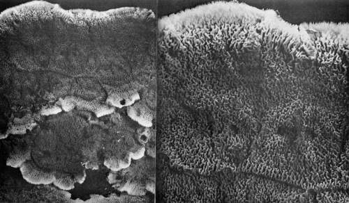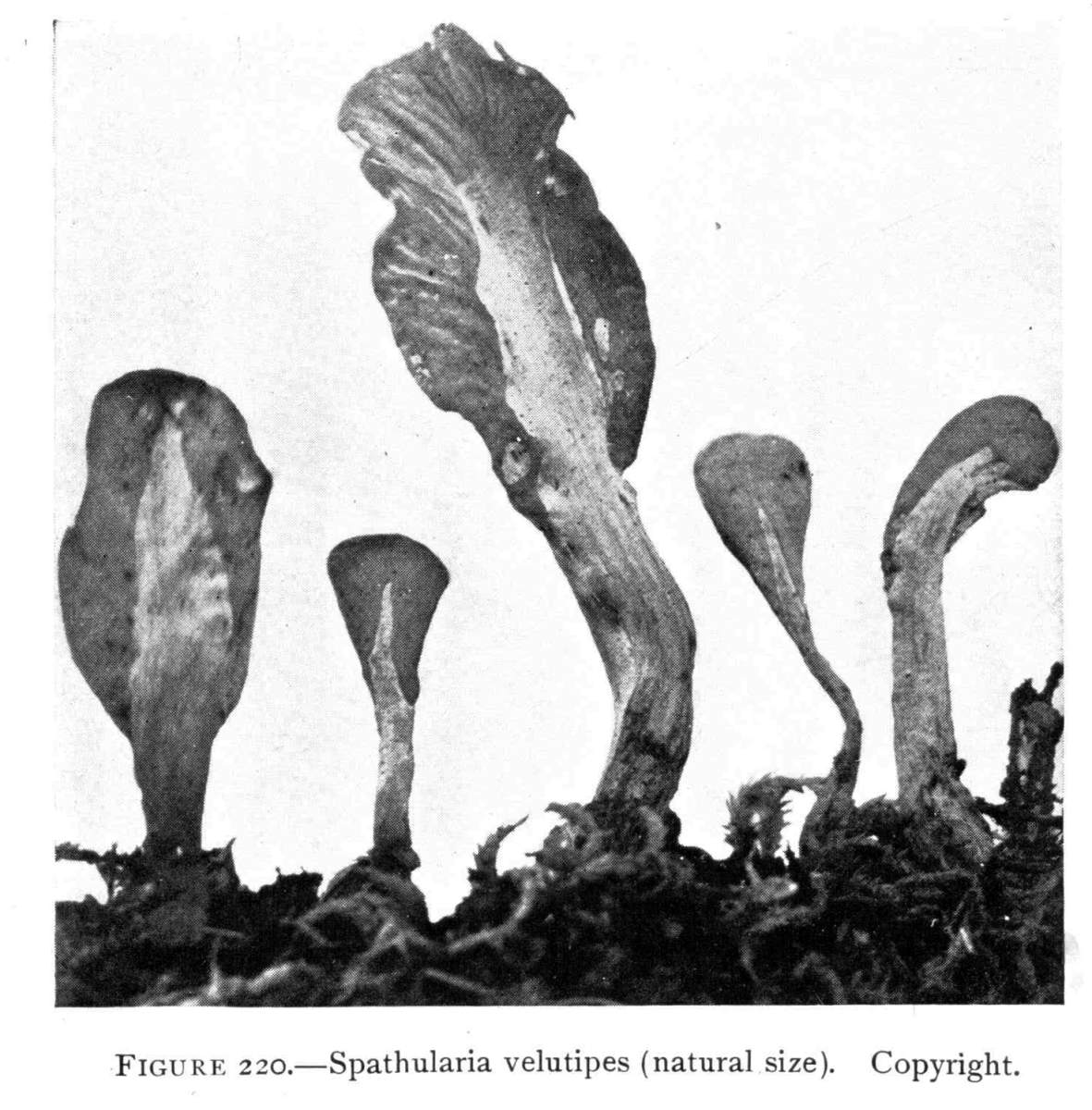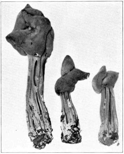 The cause of this turning of the stem from the horizontal position, so that the pileus will be brought parallel with the surface of the earth, is the stimulus from the force of gravity, which has been well demonstrated in the case of the higher plants. That is, the force which causes the stems of the higher plants to grow upward also regulates the position of the cap of the pileated fungi. The reason for this is to be seen in the perfection with which the spores are shed from the surfaces of the gills by falling downward and out from the crevices between. The same is true with the shelving fungi on trees,[Pg 15] etc., where the spores readily fall out from the pores of the honey-combed surface or from between the teeth of those sorts with a spiny under surface. If the caps were so arranged that the fruiting surface came to be on the upper side, the larger number of the spores would lodge in the crevices between the extensions of the fruiting surface. Singularly, this position of the fruiting surface does occur in the case of one genus with a few small species.