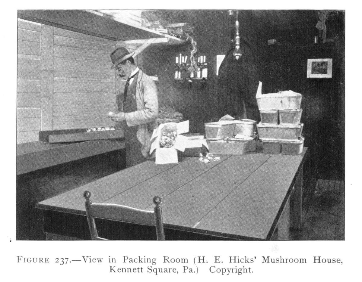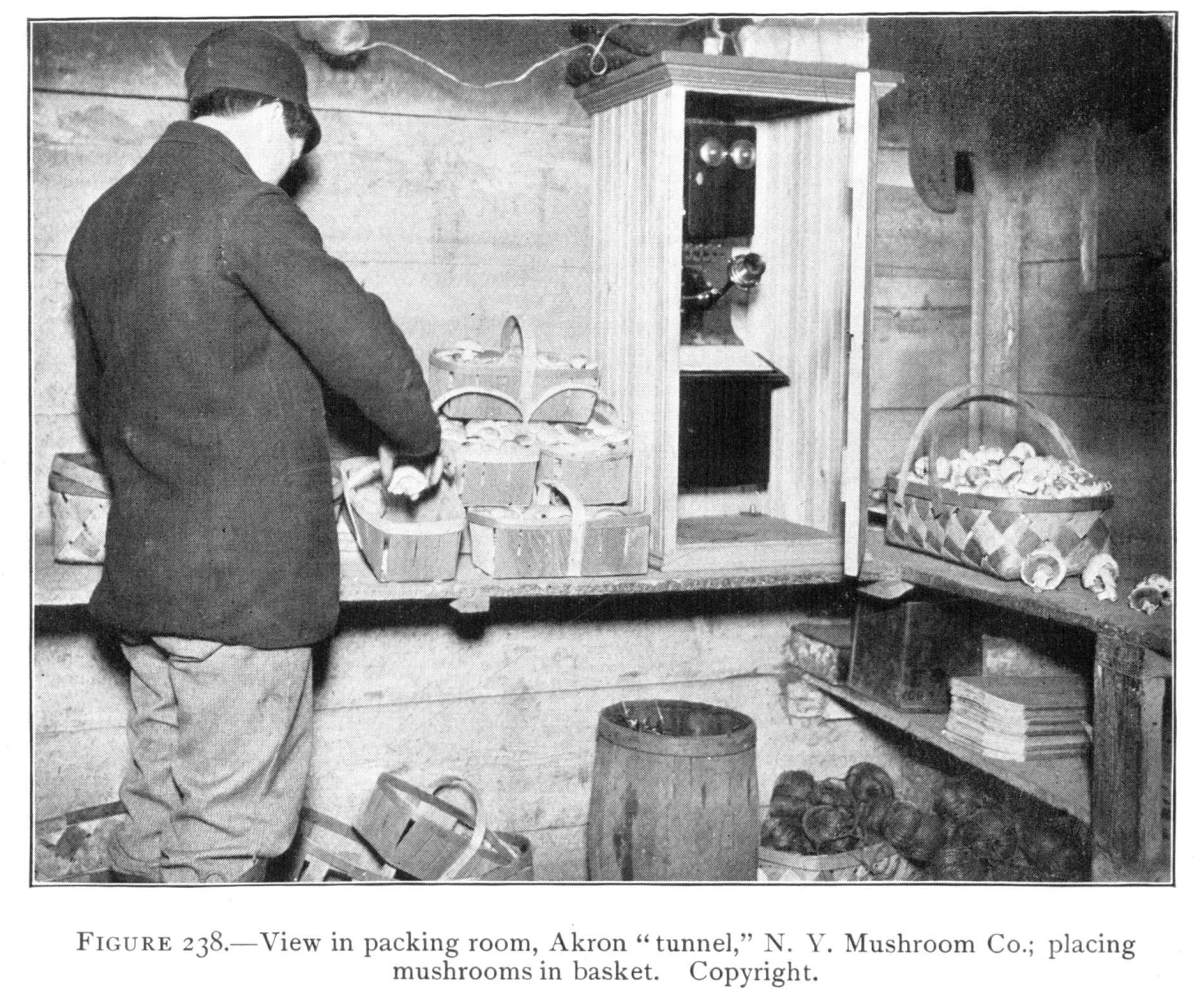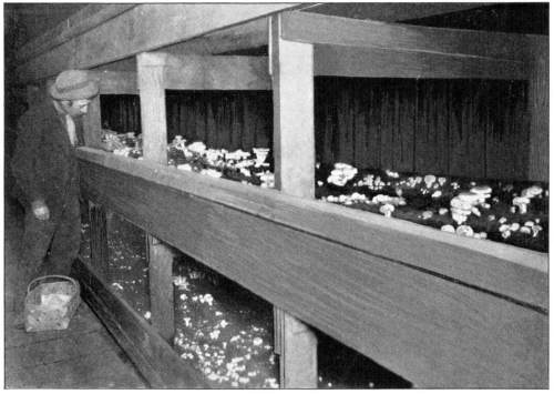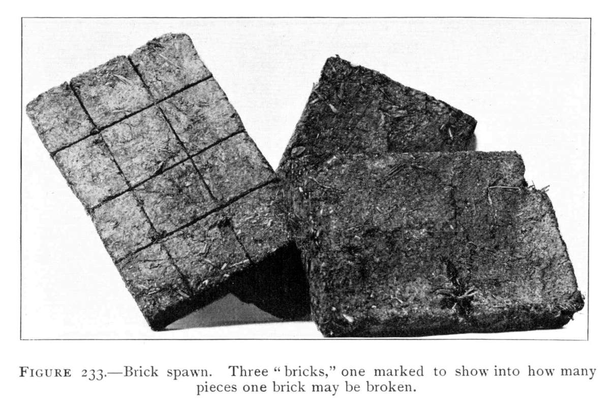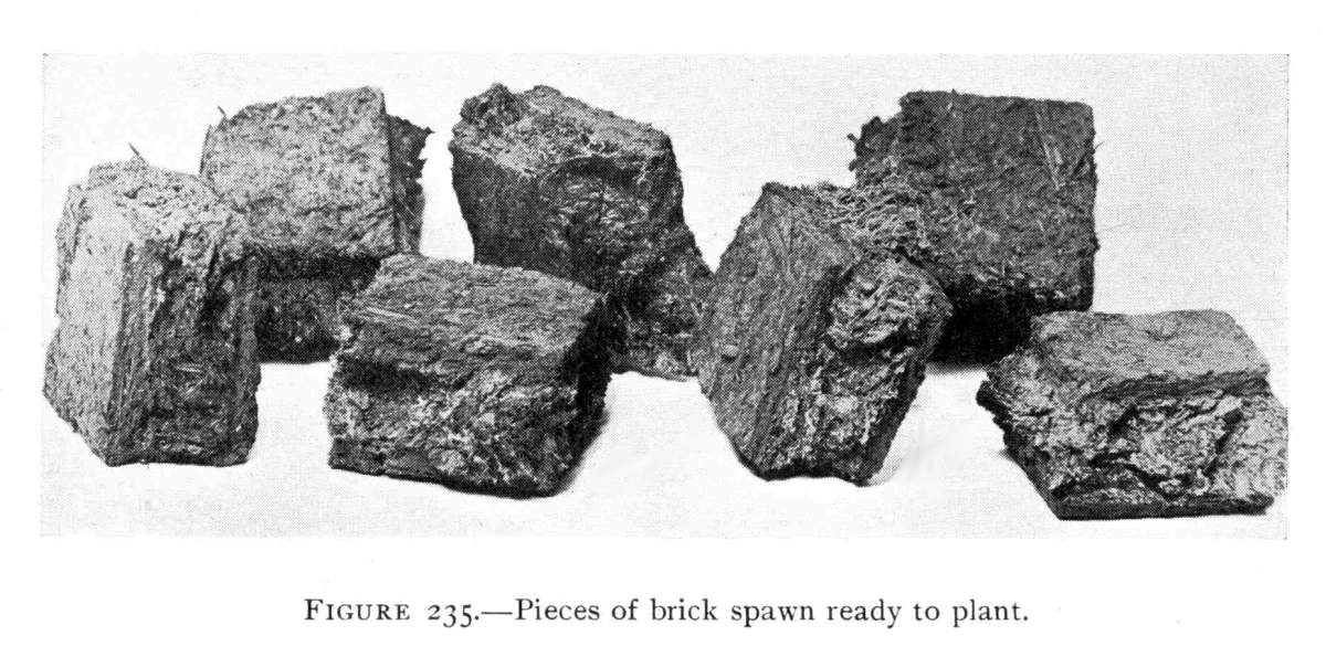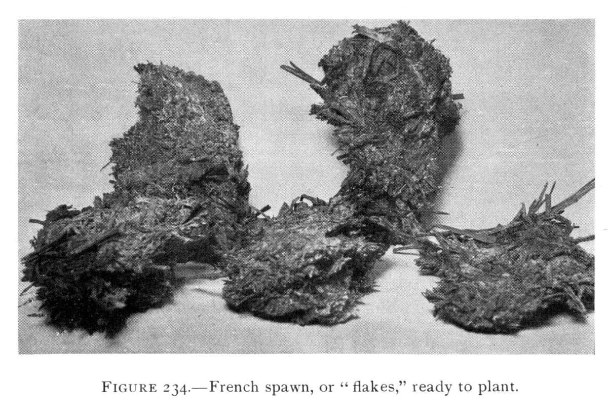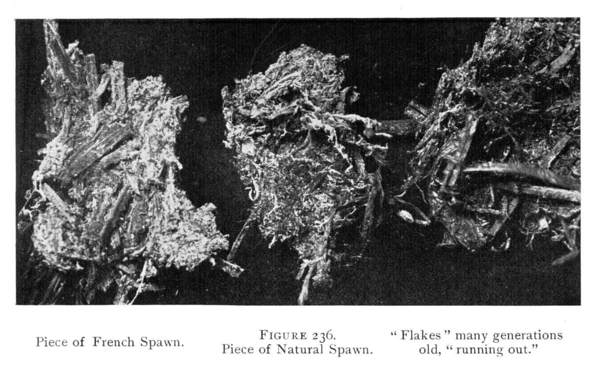 Nature of Mushroom Spawn.—This spawn, it should be clearly understood, is not spawn in the sense in which that word is used in fish culture; though it may be employed so readily in propagation of mushrooms. The spawn is nothing more than the vegetative portion of the plant. It is made up of countless numbers of delicate, tiny, white, jointed threads, the mycelium.
