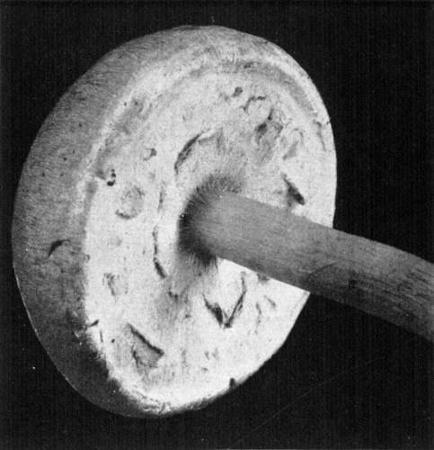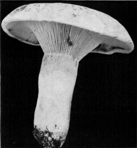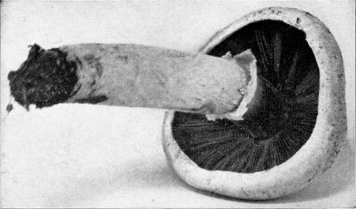 The Stem or Stipe.—The stem in this plant, as in many other kinds, is attached to the pileus in the center. The purpose of the stem seems quite surely to be that of lifting the cap and the gills up above the ground, so that the spores can float in the currents of air and be readily scattered. The stem varies in length from 2–10 cm. and is about 1–1-1/2 cm. in diameter. It is cylindrical in form, and even, quite firm and compact, though sometimes there is a central core where the threads are looser. The stem is also white and fleshy, and is usually smooth.