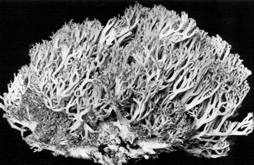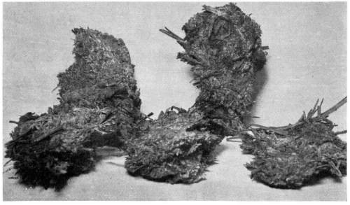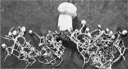 Figure 3.—Agaricus campestris. Soil washed from the "spawn" and "buttons," showing the young "buttons" attached to the strands of mycelium. (1-1/4 natural size.)