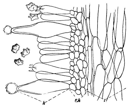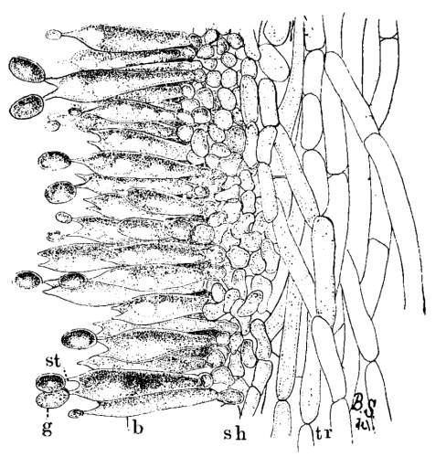 Figure 8.—Agaricus campestris. Section of gill showing tr==trama; sh==sub-hymenium; b==basidium, the basidia make up the hymenium; st==sterigma; g==spore. (Magnified.)