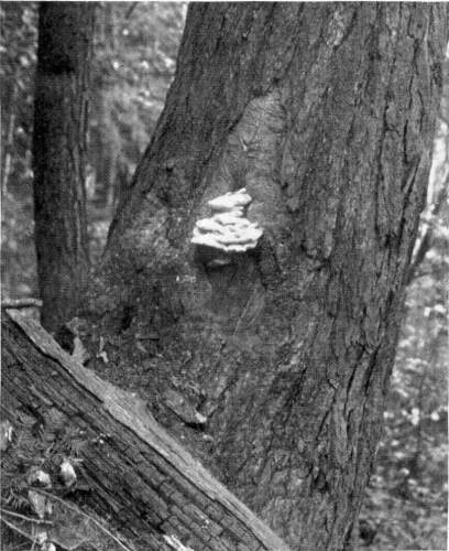 Mycelium of the Wood Destroying Fungi.—While the fruit bodies are on the outside of the trunk, the mycelium, or vegetative part of the fungus, is within the wood or bark. By stripping off the bark from decaying logs where these fungi are growing, the mycelium is often found in great abundance. By tearing open the rotting wood it can be traced all through the decaying parts. In fact, the mycelium is largely if not wholly responsible for the rapid disintegration of the wood. In living trees the mycelium of certain bracket fungi enters through a wound and grows into the heart wood. Now the heart wood is dead and cannot long resist the entrance and destructive action of the mycelium. The mycelium spreads through the heart of the tree, causing it to rot (Fig. 10). When it has spread over a large feeding area it can then grow out through a wound or old knothole[Pg 11] and form the bracket fruit body, in case the knothole or wound has not completely healed over so as to imprison the fungus mycelium.