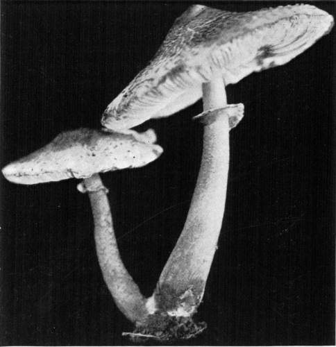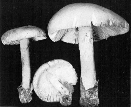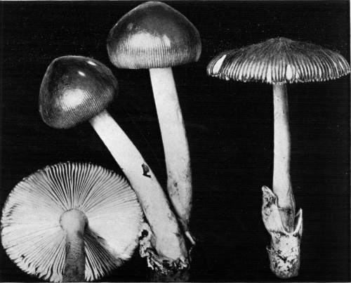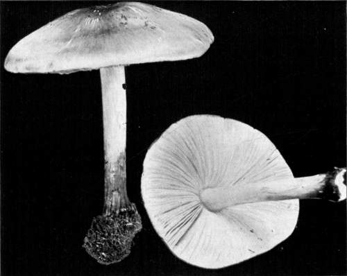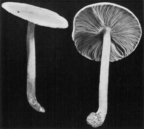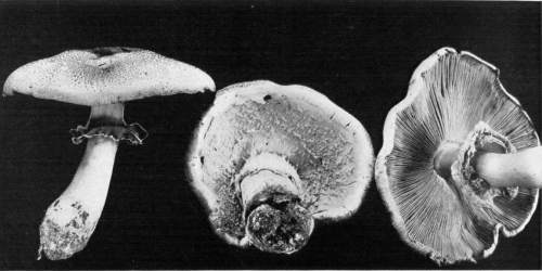 Presence or Absence of Ring or Volva.—Of the mushrooms which have stems there are four types with respect to the presence or absence of the ring and volva. In the first type both the ring and volva are absent, as in the common fairy ring mushroom, Marasmius oreades; in the genus Lactarius, Russula, Tricholoma, Clitocybe, and others. In the second type the ring is present while the volva is absent, as in the common mushroom, Agaricus campestris, and its close allies; in the genus Lepiota, Armillaria, and others. In the third type the volva is present, but the ring is absent, as in the genus Volvaria, or Amanitopsis. In the fourth type both the ring and volva are present, as in the genus Amanita.