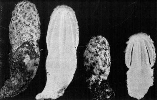 Figure 4.—Agaricus campestris. Sections of "buttons" at different stages, showing formation of gills and veil covering them. (Natural size.)