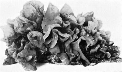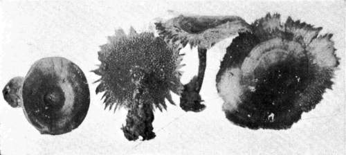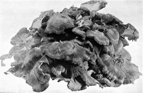 In the woods, especially in the case of the perennial shelving fungi, interesting cases are met with. Figure 15 illustrates one of these peculiar forms of Polyporus (Fomes) applanatus. This is the species so often collected as a "curio," and on account of its very white under surface is much used for etching various figures. In the figure the larger cap which is horizontal represents the position of the plant when on the standing maple trunk. When the tree fell[Pg 16] the shelf was brought into a perpendicular position. The fungus continued to grow, but its substance being hard and woody it cannot turn as the mushroom can. Instead, it now grows in such a way as to form several new caps, all horizontal, i. e., parallel with the surface of the earth, but perpendicular to the old shelf. If the page is turned one-fourth way round the figure will be brought in the position of the plant when it was growing on the fallen log.