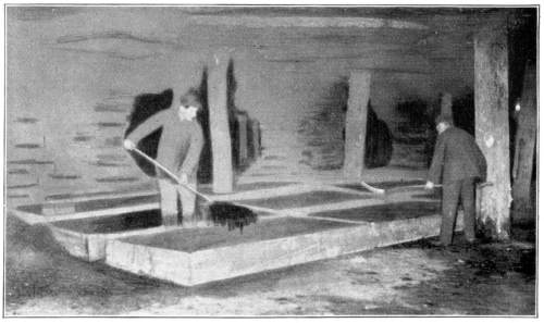 Mycelium of Coal Mine Fungi.—The mycelium of the mushrooms and bracket fungi grows in wonderful profusion in these abandoned coal mines. So far down in the moist earth the air in the tunnels or passages where the coal or rock has been removed is at all times nearly saturated with moisture. This abundance of moisture, with the favorable temperature, permits the mycelium to grow on the surface of the wood structures as readily as within the wood.