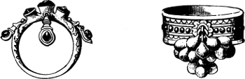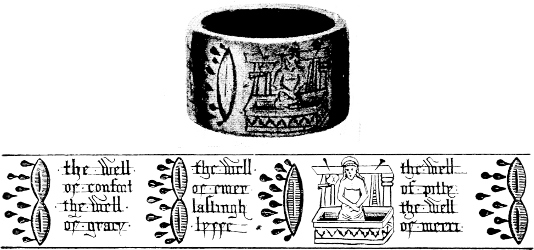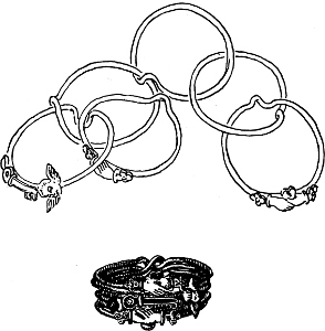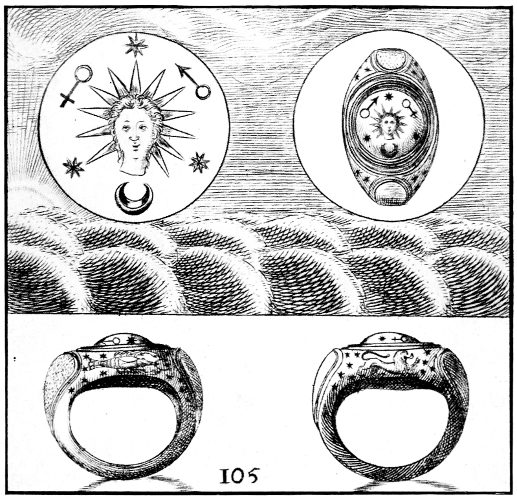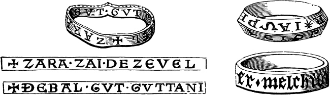Rings as charms and talismans form a class apart. Often the peculiar form of the circlet was conceived to have a symbolic virtue, but more frequently the talismanic quality depended upon some curious engraved device, upon the stones set in the rings, or upon a mystic or religious inscription. Rings of healing were talismans valued for their special power to cure disease; the “cramp rings,” dated in legend back to the time of Edward the Confessor, were notable in this series.