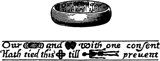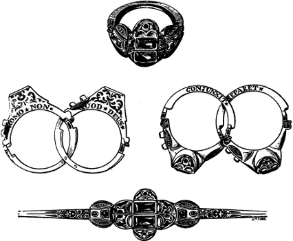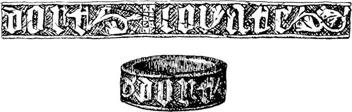 Closely connected with these religious rings, are the betrothal and wedding rings. Here it has seemed best to group together the available data, since the line of demarcation between engagement and wedding rings, though clearly enough marked to-day, is not easy to draw in regard to earlier times. A very full selection of mottoes has been added, some of which might still be used; the greater number, however, belong to a past age, upon the sentiments of which they cast interesting side lights.
