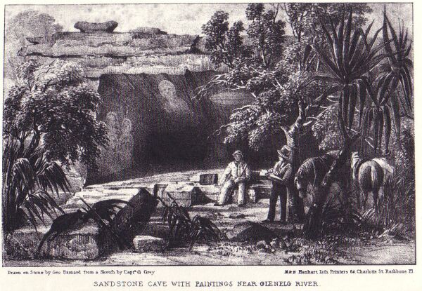 2. Sandstone Cave with Paintings near Glenelg River. Drawn on stone by George Barnard from a sketch by Captain George Grey. M. and N. Hanhart, Lithographic Printers, 64 Charlotte Street, Rathbone Place.