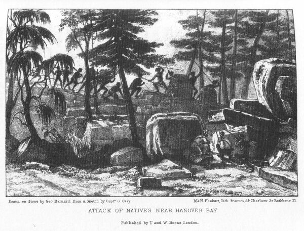 I was occupied in sketching in a portion of the coastline, and whilst thus engaged I thought I saw the figures of two natives moving upon a hill a few hundred yards to the north of us; they appeared to me to be behind some low bushes which were close to the summit of this hill. I watched the bushes narrowly and felt nearly confident I saw them; but however to be sure beyond a doubt I got up and took my eyes from the spot for a few seconds whilst I walked to get my telescope. I then carefully examined the hill with the glass and could see nothing but the low bushes on it. "A pretty bushman I am," I thought to myself, "to be thus deceived with two old shrubs; I should have known a native better;" and with a feeling almost of annoyance at my mistake I resumed my seat on an inverted water-keg and went on with my drawing. Within a minute's time an alarm of natives was given, and starting up I saw from twenty to thirty on some sandhills to the north of us, distant about two hundred yards; their spears were fixed in their throwing-sticks and they evidently were prepared for a fray. I therefore ran to the boat for my gun, which Ruston tried to get out for me; and at this moment, on casting my eyes upwards, I saw a native start up on the sandbank not more than fifteen yards from Ruston and myself; he poised his spear for one second, and it then came whistling at us. I dodged and the spear flew past without my seeing what became of it. I instantly gave the order to watch the bank and to fire at anything that showed itself above it; and Mr. Walker now had got hold of his gun and very gallantly ran up the bank and occupied it: in the meantime the native who had thrown the spear caught up a bag in each hand and ran off. Several shots which were fired at the distant natives scraped up the sand so near them that they found it prudent to decamp as speedily as they could.