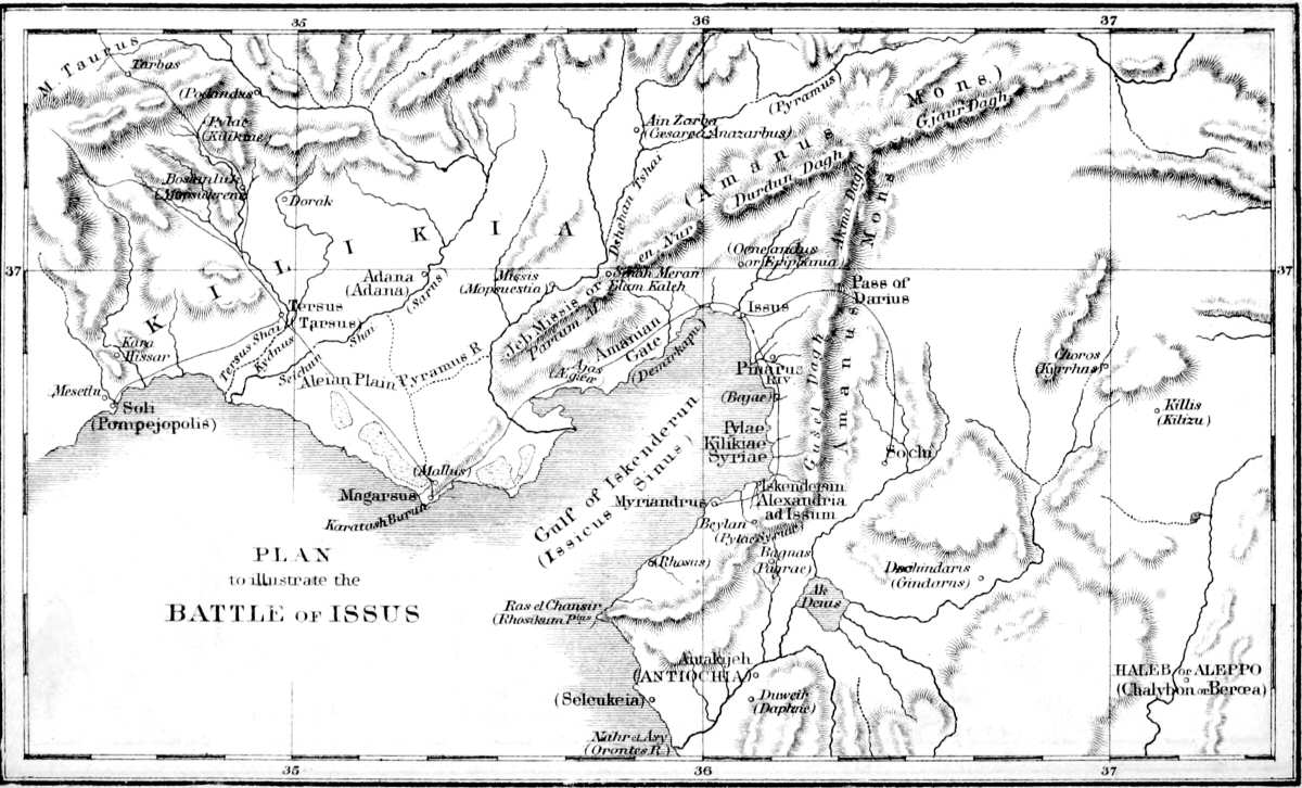 Alexander cuts the Gordian knot. — He refuses the liberation of the Athenian prisoners. — Progress of Memnon and the Persian fleet — they acquire Chios and a large part of Lesbos — they besiege Mitylene. Death of Memnon. Capture of Mitylene. — Hopes excited in Greece by the Persian fleet, but ruined by the death of Memnon. — Memnon’s death an irreparable mischief to Darius. — Change in Darius’s plan caused by this event. He resolves to take the offensive on land. His immense land-force. — Free speech and sound judgment of Charidemus. He is put to death by Darius. — Darius abandoned Memnon’s plans, just at the time when he had the best defensive position for executing them with effect. — Darius recalls the Grecian mercenaries from the fleet. — Criticism of Arrian on Darius’s plan. — March of Alexander from Gordium through Paphlagonia and Kappadokia. — He arrives at the line of Mount Taurus — difficulties of the pass. — Conduct of Arsames, the Persian satrap.[p. vi] Alexander passes Mount Taurus without the least resistance. He enters Tarsus. — Dangerous illness of Alexander. His confidence in the physician Philippus, who cures him. — Operations of Alexander in Kilikia. — March of Alexander out of Kilikia, through Issus, to Myriandrus. — March of Darius from the interior to the eastern side of Mount Amanus. Immense numbers of his army: great wealth and ostentation in it: the treasure and baggage sent to Damascus. — Position of Darius on the plain eastward of Mount Amanus. He throws open the mountain passes, to let Alexander come through and fight a pitched battle. — Impatience of Darius at the delay of Alexander in Kilikia. He crosses Mount Amanus to attack Alexander in the defiles of Kilikia. — He arrives in Alexander’s rear, and captures Issus. — Return of Alexander from Myriandrus: his address to his army. — Position of the Macedonian army south of the river Pinarus. — Position of the Persian army north of the Pinarus. — Battle of Issus. — Alarm and immediate flight of Darius — defeat of the Persians. — Vigorous and destructive pursuit by Alexander — capture of the mother and wife of Darius. — Courteous treatment of the regal female prisoners by Alexander. — Complete dispersion of the Persian army — Darius recrosses the Euphrates — escape of some Perso-Grecian mercenaries. — Prodigious effect produced by the victory of Issus. — Effects produced in Greece by the battle of Issus. Anti-Macedonian projects crushed. — Capture of Damascus by the Macedonians, with the Persian treasure and prisoners. Capture and treatment of the Athenian Iphikrates. Altered relative position of Greeks and Macedonians. — Alexander in Phenicia. Aradus, Byblus, and Sidon open their gates to him. — Letter of Darius soliciting peace and the restitution of the regal captives. Haughty reply of Alexander. — Importance of the voluntary surrender of the Phenician towns to Alexander. — Alexander appears before Tyre — readiness of the Tyrians to surrender, yet not without a point reserved — he determines to besiege the city. — Exorbitant dispositions and conduct of Alexander. — He prepares to besiege Tyre — situation of the place. — Chances of the Tyrians — their resolution not unreasonable. — Alexander constructs a mole across the strait between Tyre and the mainland. The project is defeated. — Surrender of the princes of Cyprus to Alexander — He gets hold of the main Phenician and Cyprian fleet. — He appears before Tyre with a numerous fleet, and blocks up the place by sea. — Capture of Tyre by storm — desperate resistance by the citizens. — Surviving males, 2000 in number, hanged by order of Alexander — The remaining captives sold. — Duration of the siege for seven months. Sacrifice of Alexander to Herakles. — Second letter from Darius to Alexander, who requires unconditional submission. — The Macedonian fleet overpowers the Persian and becomes master of the Ægean with the islands. — March of Alexander towards Egypt — siege of Gaza. — His first assaults fail — he is wounded — he erects an immense mound round the town. — Gaza is taken by storm, after a siege of two months. — The garrison are all slain, except the governor Batis, who becomes prisoner, severely wounded. — Wrath of Alexander against Batis, whom he causes to be tied to a chariot, and dragged round the town. — Alexander enters Egypt, and occupies it without resistance — He determines on founding Alexandria. — His visit to the temple and oracle of Ammon. The oracle proclaims him to be the son of Zeus. — Arrangements made by Alexander at Memphis. — Grecian prisoners brought from the Ægean. — He proceeds to Phenicia — message from Athens. Splendid festivals. Reinforcements sent to Antipater. — He marches to the Euphrates — crosses it without opposition at Thapsakus. — March across from the Euphrates to the Ti[p. vii]gris. Alexander fords the Tigris above Nineveh, without resistance. — Eclipse of the moon. Alexander approaches near the army of Darius in position. — Inaction of Darius since the defeat at Issus. — Paralyzing effect upon him produced by the captivity of his mother and wife. — Good treatment of the captive females by Alexander — necessary to keep up their value as hostages. — Immense army collected by Darius, in the plains eastward of the Tigris — near Arbela. — He fixes the spot for encamping and awaiting the attack of Alexander — in a level plain near Gaugamela. — His equipment and preparation — better arms — numerous scythed chariots — elephants. — Position and battle array of Darius. — Preliminary movements of Alexander — discussions with Parmenio and other officers. His careful reconnoitring in person. — Dispositions of Alexander for the attack — array of the troops. — Battle of Arbela. — Cowardice of Darius — he sets the example of flight 