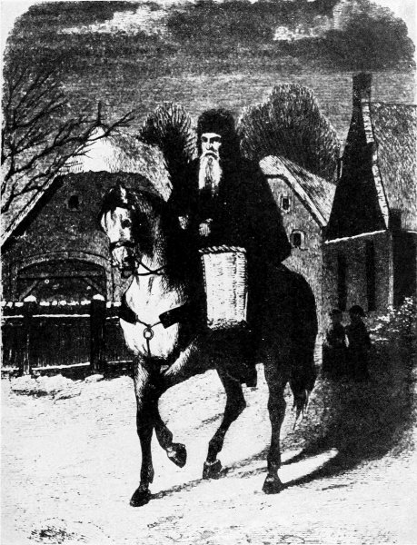 An older authority records concerning Belgium that often in country districts this or that peasant makes up as a long-bearded man or bishop and rides through the dark streets on a gray horse, or an ass, or a wooden horse, with a great basket at his side and a bundle of whips in his hand.[16]