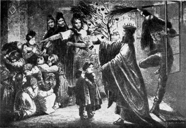 “He asks the parents how the little ones have behaved themselves during the year. To each of those who have been good, he gives a present from his bag. But woe betide the naughty ones! These are not only supposed to get no presents, but Pelznickel catches them by the collar and playfully taps them with his switch.”[25]