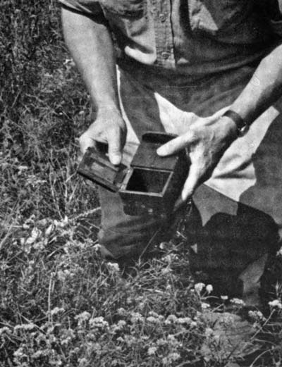 Now it is time to move. One might ask why, knowing the direction and the approximate distance, one does not immediately hunt for the tree. The answer is that there are ten thousand trees in the woods and only one the bee tree. One can never be sure of the exact line or, with any exactitude, the distance. Sometimes when one has narrowed the problem to an area of a hundred yards square, it is hard to find the tree. So once more the bee box is placed on the[22] stand, a loaded comb dropped into the front compartment and the lid left open. The spare comb should be hidden carefully. Great ire on the part of the bees. They again become suspicious and do not want to enter the box. As more arrive, the air is filled with a disgusted humming. In time the temptation is too great and one after another a bee drops down to the comb. When ten or a dozen have done so, snap down the lid of the box and drive them into the rear compartment as before. They are reluctant to go, but a puff of cigarette smoke blown through a crack in the lid will send them scurrying to the rear in search of purer air. Close the slide, reopen the box, place it on the stand and catch another lot. Catch all you can. Then pull up the stand, gather up your paraphernalia and move three or four hundred yards down the line. Then set up the stand and release the bees in batches of eight or ten.