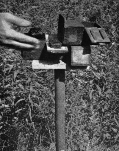 Provided with a dozen bees one is ready to start the line. Fill one of the pieces of comb with syrup. Thrust in the stand if you have one. Open the window into the outer compartment and the door between and admit three or four bees to the part with the comb. They will come if you open the window in front and darken the rear. Then put the box down gently, darken the whole box, put your hat over it and leave it still for three or four minutes. Meanwhile, fill the other comb. After three or four minutes, place the box on the stand and gently open the lid. If conditions are right, the bees will have found the syrup and taken a load in the darkness. Sometimes one or two will not have finished loading and will sit quietly until they are stuffed to capacity. If they are loaded, they will fly comparatively slowly as they take off to return to the hive. When they have left, repeat the whole process and let out more bees until all have gone. You are now in the stage of starting to establish the line.