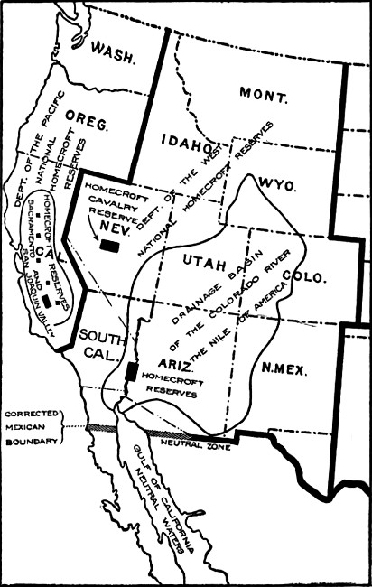 United States owns land, water and power—Development by national government would result in vast profit to it—Australian System of Land Reclamation and Settlement should be adopted—Action should be prompt to forestall friction between United States and Japan—Will never have war with Japan except as result of apathy and neglect—United State must create in Colorado River Valley dense population settled in self-containing Communities—Characteristics of Country particularly adapt it to requirements for Homecroft Reserve—Safety of Southern California from invasion would be insured—Military Highways to San Diego and Los Angeles—Defense of Mexican Border—Homecroft Cavalry Reserve in Nevada similar to Cossack Cavalry System—Correction of Mexican Boundary Line to include mouth of Colorado River in the United States—New State of South California to be formed.