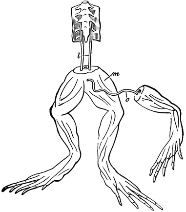 195 A frog’s brain is removed, and the body then suspended by the lower jaw, the legs are allowed to dip into a slightly acidulated liquid, the chemical action of which stimulates the skin.