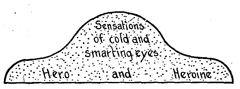 The Wave in the Stream of Consciousness.—The surface of our mental stream is not level, but is broken by a wave which stands above the rest; which is but another way of saying that some one thing is always more prominent in our thought than the rest. Only when we are in a sleepy reverie, or not thinking about much of anything, does the stream approximate a level. At all other times some one object occupies the highest point in our thought, to the more or less complete exclusion of other things which we might think about. A thousand and one objects are possible to our thought at any moment, but all except one thing occupy a secondary place, or are not present to our consciousness at all. They exist on the margin, or else are clear off the8 edge of consciousness, while the one thing occupies the center. We may be reading a fascinating book late at night in a cold room. The charm of the writer, the beauty of the heroine, or the bravery of the hero so occupies the mind that the weary eyes and chattering teeth are unnoticed. Consciousness has piled up in a high wave on the points of interest in the book, and the bodily sensations are for the moment on a much lower level. But let the book grow dull for a moment, and the make-up of the stream changes in a flash. Hero, heroine, or literary style no longer occupies the wave. They forfeit their place, the wave is taken by the bodily sensations, and we are conscious of the smarting eyes and shivering body, while these in turn give way to the next object which occupies the wave. Figs. 1-3 illustrate these changes.
