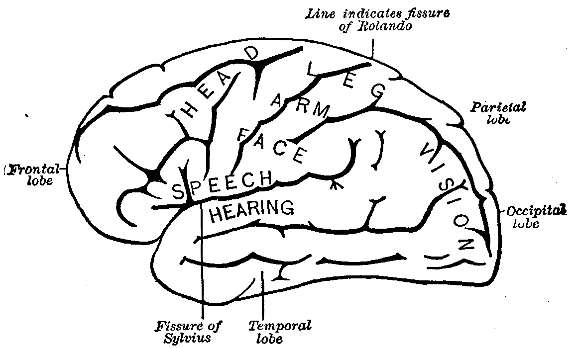 Consciousness Works through the Nervous System.—Later13 science has taught that the mind resides in and works through the nervous system, which has its central office in the brain. And the reason why I seem to be in every part of my body is because the nervous system extends to every part, carrying messages of sight or sound or touch to the brain, and bearing in return orders for movements, which set the feet a-dancing or the fingers a-tingling. But more of this later.