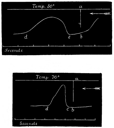It is somewhat difficult, in the case of paralyzed swimming organs, to prove the occurrence of a contraction in response to thermal stimulation, from the fact that while these tissues are not nearly so sensitive to this mode of excitation as might be anticipated, they are, as just observed, extraordinarily sensitive to mechanical excitation. It therefore becomes difficult to administer the appropriate thermal stimulus without at the same time causing a sufficient mechanical disturbance to render it doubtful to which of the stimuli the response is due. This may be done, however, by allowing a few drops of heated sea-water to run over the excitable surface while it is exposed to the air. In this and in other ways I have satisfied myself that the paralyzed tissues of swimming organs respond to sudden elevations of temperature.