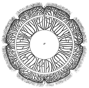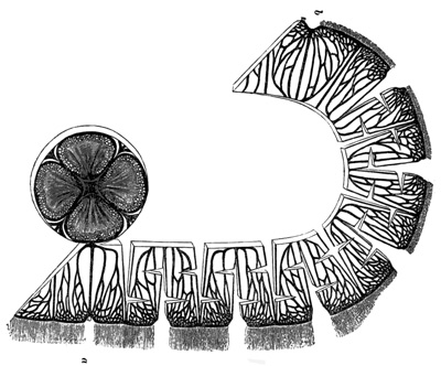 The manubrium is the mouth and stomach of the animal, and at the point where it is attached to or suspended from the umbrella its central cavity opens into a tube-system, which radiates through the lower or concave aspect of the umbrella. This tube-system, which serves to convey digested material and may therefore be regarded as intestinal in function, presents two different forms in the two 12 main groups into which the Medusæ are divided. In the "naked-eyed" group, the tubes are unbranched and run in a straight course to the margin of the umbrella, where they open into a common circular tube which runs all the way round the margin (see Figs. 1 and 22). In the "covered-eyed" group, on the other hand, the tubes are strongly branched (see Fig. 8), although they likewise all eventually terminate in a single circular tube. This circular or marginal tube in both cases communicates by minute apertures with the external medium.