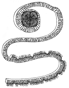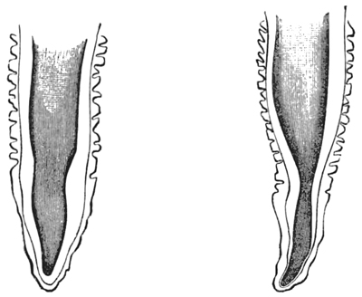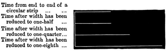 [23] It may be thought that the greater area of general tissue-mass in the larger segments than in the smaller, and not the lesser proportional area of tube-section, is the cause of the larger segments living longer than the smaller ones. I am led, however, to reject this hypothesis, because in Sarsia, where segmentation entails a comparatively small amount of tube-section, there is no constant rule as to the larger segments showing more endurance than the smaller ones—the converse case, in fact, being of nearly as frequent occurrence. I can only account for this fact by supposing that the endurance of the segments of Sarsia is determined by the degree in which the three or four minute open tube-ends become accidentally blocked. This supposition is the only one I can think of to account for the astonishing contrasts as to endurance that are presented by different segments of the same individual, and, I may add, of different individuals when deprived of their margins and afterwards submitted to the same conditions. For instance, a number of equally vigorous specimens had their margins removed, and were then suspended in a glass cage attached to a buoy in the sea. Four days afterwards some of the specimens were putrid, while others were as fresh as they were when first operated on. Again, as an instance of the experiments in segmentation of Sarsia, I may quote an experiment in which a score of specimens were divided in all sorts of ways, such as leaving the manubrium attached, to one half, or three marginal bodies in one portion and the remaining marginal body in the other portion, etc. Yet, although it was very exceptional to find the two portions presenting an equal degree of endurance, no uniform results pointing to the cause of the variations could be obtained. In most cases, however, the energy, as distinguished from the endurance of the larger segments, was conspicuously greater than that of the smaller. (But it is curious that in many cases the effects of shock appeared to be more marked in the larger than in the smaller segments—the latter, for some time after the operation, contracting much more frequently than the former.) To show both these effects, one experiment may be quoted. A specimen of Sarsia was divided into two parts, of which one was a quadrant.