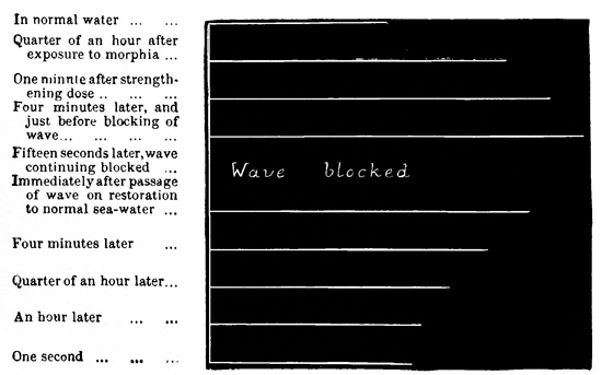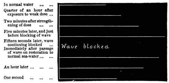 [33] Since the above results on the effects of poisons were published in my Royal Society papers, Dr. Krukenberg has conducted a research upon "comparative toxicology," in which he has devoted the larger share of his attention to the Medusæ. While expressing my gratification that when he adopted my methods he succeeded in confirming my results, I may observe that the criticism which he somewhat bluntly passes upon the latter is not merely unwarranted, but based upon a strange misconception of a well-known principle in the physiology of nerves and muscles. This criticism is that these results as published by me are worthless and "a dead chapter in science," because I failed to prove that it was the nervous (as distinguished from the muscular) elements which were effected by the various poisons. In his opinion this distinction can only be made good by employing electrical stimulation upon the sub-umbrella tissue when this has lost its spontaneity under the influence of poisons: if a response ensues which does not ensue when the tissue is stimulated mechanically, he regards the fact as proof that the muscular tissue remains unaffected while the nervous tissue has been rendered functionless.