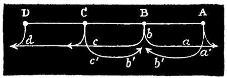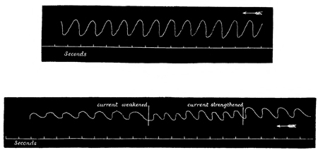 [13] In a highly interesting paper recently published by Dr. W. H. Gaskell, F.R.S., on "The Innervation of the Heart" (Journ. of Physiol., vol. iv. p. 43, et seq.), it is shown that the experiments in section thus far described yield strikingly similar results when performed upon the heart of the tortoise and the heart of the skate. Dr. Gaskell inclines to the belief that in these cases the contraction-waves are merely muscle-waves. There is one important fact, however, which even here seems to me to indicate that the propagation of the wave is at least in some measure dependent on nervous conduction. This fact is, that after a contraction-wave has been blocked by the activity of a spiral or other form of section, it may again be made to force a passage under the influence of vagus stimulation. Moreover, in a paper still more recently published by Drs. Brunton and Cash on "Electrical Stimulation of the Frog's Heart" (Proc. Roy. Soc., vol. xxxv., No. 227, p. 455, et seq.) it is remarked, "Another interesting consideration is, whether the stimulus which each cavity of the heart transmits to the succeeding one consists in the propagation of an actual muscular wave, or in the propagation of an impulse along the nerves. The observations of Gaskell have given very great importance to the muscular wave occurring in each cavity of the heart of cold-blooded animals as a stimulus to the contraction of the next succeeding cavity. Our observations appear to us to show that, while this in an important factor, it is not the only one in the transmission of stimuli.... We consider that stimuli are also propagated from one chamber of the heart to another through nervous channels: thus we find that irritation of the venus sinus will sometimes produce simultaneous contractions of the auricle and ventricle, instead of the ventricular beat succeeding the auricular in the ordinary way. This we think is hardly consistent with the hypothesis, that a stimulus consists of the propagation of a muscular wave only from the auricle to the ventricle."