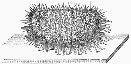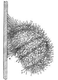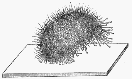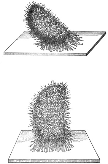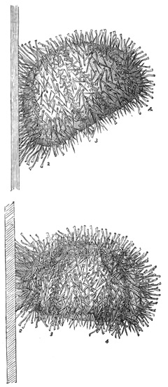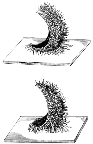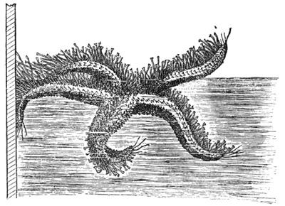 [40] A further proof that this is at least one of the functions of the pedicellariæ is furnished by a simple experiment. If an Echinus is allowed to attach its feet to a glass plate held just above its ab-oral pole, and this plate be then raised in the water so that the Echinus is freely suspended in the water by means of its feet alone, the animal feels, as it were, that its anchorage is insecure, and actively moves about its unattached feet to seek for other solid surfaces. Under such circumstances it may be observed that the pedicellariæ also become active, and especially so near the surface of attachment as if seeking for pieces of sea-weed. If a piece is presented to them, they lay hold upon it with vigour.