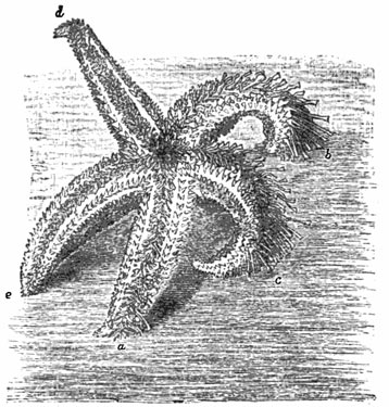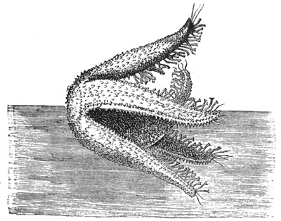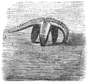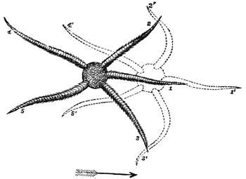[39] In this case the locomotion of a Star-fish comes to be performed on the same plan or method as that of a Jelly-fish—the five rays performing, by their co-ordinated action, the same function as a swimming-bell. It is a curiously interesting fact, that although no two plans or mechanisms of locomotion could well be imagined as more fundamentally distinct than those which are respectively characteristic of these two groups of animals, nevertheless in this particular case and in virtue of special modification, a Star-fish should have adopted the plan or mechanism of a Jelly-fish.
