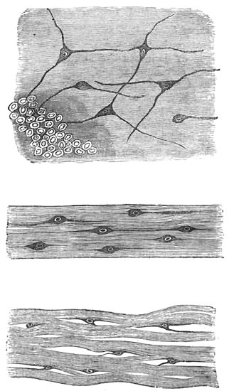 Nerve-tissue, then, universally consists of two elementary structures, viz. very minute nerve-cells and very minute nerve-fibres. The fibres proceed to and from the cells, so in some cases serving to unite the cells with one another, and in other cases with distant parts of the animal body. Nerve-cells are usually found collected together in aggregates, which are called nerve-centres or ganglia, to and from which large bundles of nerve-fibres come and go.