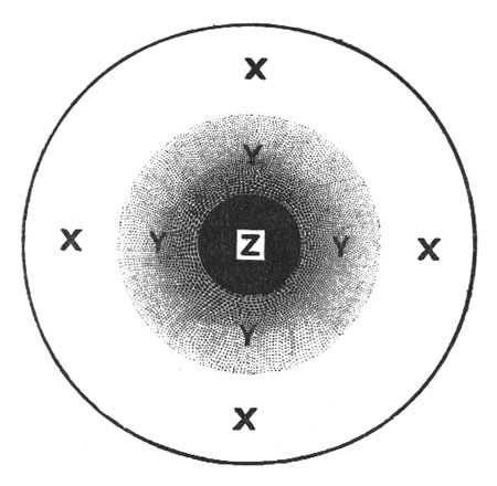 Next we must notice that besides our own subjectivities, we have cognizance of being surrounded by many other inferred subjectivities more or less like in kind (i. e. other human minds); and also yet many other inferred subjectivities more or less unlike, but all inferior (i. e. the minds of lower animals, young children, and idiots). Following Clifford, I will call these inferred subjectivities by the name of ejects, and assign to them the symbol y. Thus, in the following discussion, x = the objective world, y = the ejective world, and z = subjective world. Now, the theory of Monism supposes that x, y, and z are all alike in kind, but present no definite[Pg 94] teaching as to how far they may differ in degree. We may, however, at once allow that between the psychological value of z and that of y there is a wide difference of degree; and also that, while the value of z is a fixed quantity, that of y varies greatly in the different parts of the area y. Our scheme, therefore, will now adopt this form—