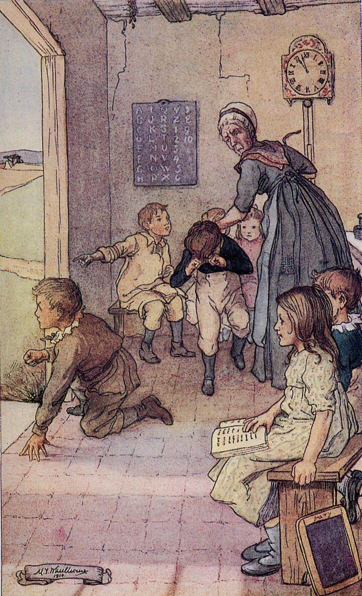 They went on with their talk, which, as far as I can recall it, was complimentary to none but the two women themselves. Meantime I was making what observations my terror would allow. About a dozen children were seated on forms along the walls, looking over the tops of their spelling-books at the newcomer. In the farther corner two were kicking at each other as opportunity offered, looking very angry, but not daring to cry. My next discovery was terribly disconcerting. Some movement drew my eyes to the floor; there I saw a boy of my own age on all-fours, fastened by a string to a leg of the table at which the dame was ironing, while—horrible to relate!—a dog, not very big but very ugly, and big enough to be frightened at, lay under the table watching him. I gazed in utter dismay.