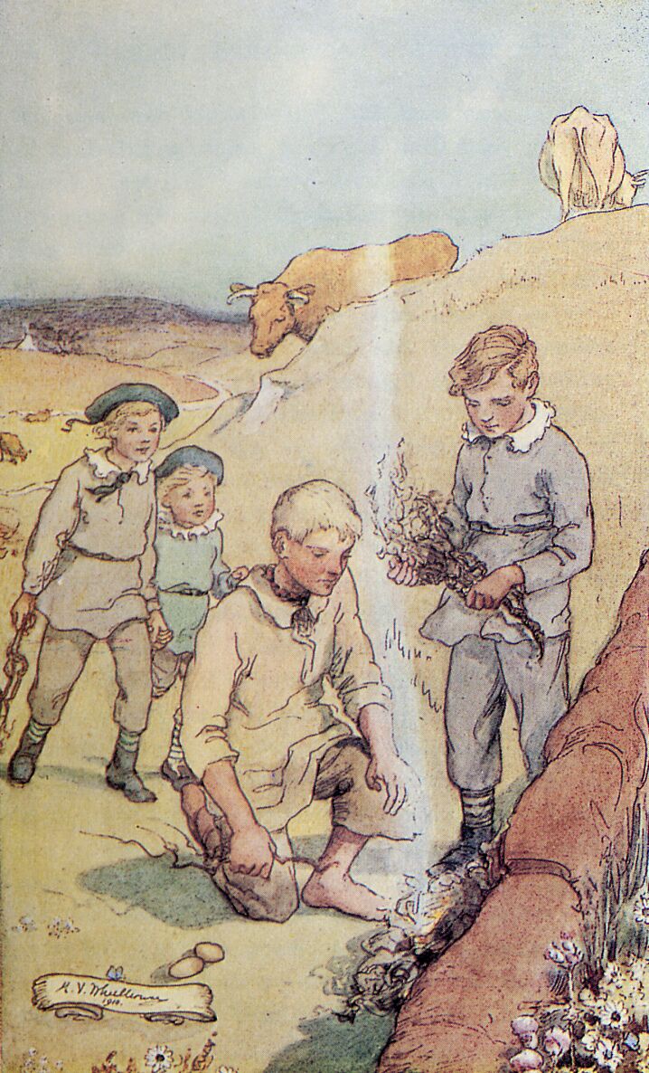 And then her stories! There was nothing like them in all that countryside. It was rather a dreary country in outward aspect, having many bleak moorland hills, that lay about like slow-stiffened waves, of no great height but of much desolation; and as far as the imagination was concerned, it would seem that the minds of former generations had been as bleak as the country, they had left such small store of legends of any sort. But Kirsty had come from a region where the hills were hills indeed—hills with mighty skeletons of stone inside them; hills that looked as if they had been heaped over huge monsters which were ever trying to get up—a country where every cliff, and rock, and well had its story—and Kirsty’s head was full of such. It was delight indeed to sit by her fire and listen to them. That would be after the men had had their supper, early of a winter night, and had gone, two of them to the village, and the other to attend to the horses. Then we and the herd, as we called the boy who attended to the cattle, whose work was over for the night, would sit by the fire, and Kirsty would tell us stories, and we were in our heaven.