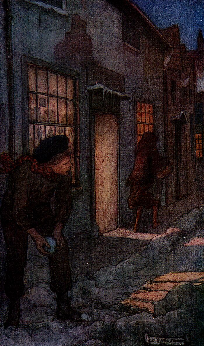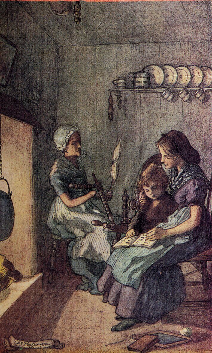 “It’s a cold night,” said Mrs. Duff. “The wind seems to blow through me as I sit at my wheel. I wish my husband would come home.”