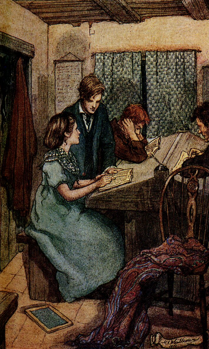 I now saw much less of Elsie; but I went with Turkey, as often as I could, to visit her at her father’s cottage. The evenings we spent there are amongst the happiest hours in my memory. One evening in particular appears to stand out as a type of the whole. I remember every point in the visit. I think it must have been almost the last. We set out as the sun was going down on an evening in the end of April, when the nightly frosts had not yet vanished. The hail was dancing about us as we started; the sun was disappearing in a bank of tawny orange cloud; the night would be cold and dark and stormy; but we cared nothing for that: a conflict with the elements always added to the pleasure of any undertaking then. It was in the midst of another shower of hail, driven on the blasts of a keen wind, that we arrived at the little cottage. It had been built by Duff himself to receive his bride, and although since enlarged, was still a very little house. It had a foundation of stone, but the walls were of turf. He had lined it with boards, however, and so made it warmer and more comfortable than most of the labourers’ dwellings. When we entered, a glowing fire of peat was on the hearth, and the pot with the supper hung over it. Mrs. Duff was spinning, and Elsie, by the light of a little oil lamp suspended against the wall, was teaching her youngest brother to read. Whatever she did, she always seemed in my eyes to do it better than anyone else; and to see her under the lamp, with one arm round the little fellow who stood leaning against her, while the other hand pointed with a knitting-needle to the letters of the spelling-book which lay on her knee, was to see a lovely picture. The mother did not rise from her spinning, but spoke a kindly welcome, while Elsie got up, and without approaching us, or saying more than a word or two, set chairs for us by the fire, and took the little fellow away to put him to bed.