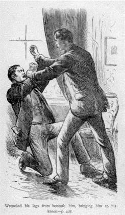 One moment John Grange had been standing there calm and happy, with the women clinging to him; the next, by a quick movement, strong yet gentle, he had shaken himself free; and as Barnett seized him by the throat to eject him from the room, he was perfectly transformed. For, with almost superhuman strength, he seized his rival in return, quickly bore him back a step or two, and then wrenched his legs from beneath him, bringing him to his knees.