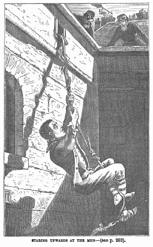 “But a new plan was now being adopted by the pursuers, who crawled on hands and knees between the ridges, one going one way, the other another way, while to my astonishment I saw the prisoner stop at the corner where the brick-burdened wall touched the building, and let down a rope of knotted blanket, hitherto hidden in the lead gutter, to which it was somehow secured. The next instant the poor fellow was over the side, swinging backwards and forwards, and turning round and round as he lowered himself quickly, staring upwards at the men, who now came up and looked over at him.