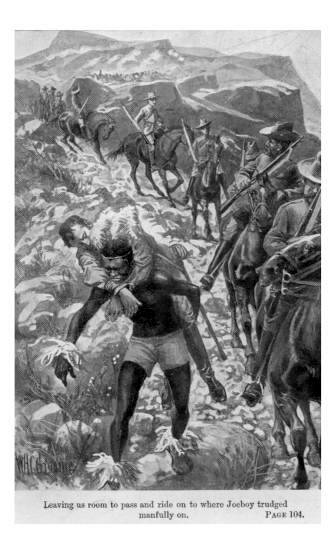 “Through a big nigger dressed up in two white ostrich-feathers, a bit of skin, and an assagai and shield for walking-stick and cloak. He brought the news, and as soon as the General had proved him a bit, two foot-regiments, ours and ‘Yallow Terror Tories,’ were sent off to make a forced march. That black—Joeboy he called himself—brought us up within striking distance, and then he went off to warn them in that old ruin that we were coming, so that they might be ready to copyrate with us.”