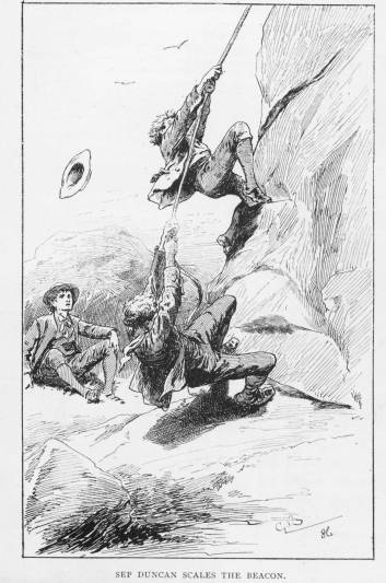 The next day came, and with it Bob Chowne from Ripplemouth and Bigley Uggleston from the Gap; and we three boys set off over the cliff path for a regular good roam, with the sun beating down on our backs, the grasshoppers fizzling in amongst the grass and ferns, the gulls squealing below us as they flew from rock to rock, and, far overhead now, a hawk wheeling over the brink of the cliff, or a sea-eagle rising from one of the topmost crags to seek another where there were no boys.
