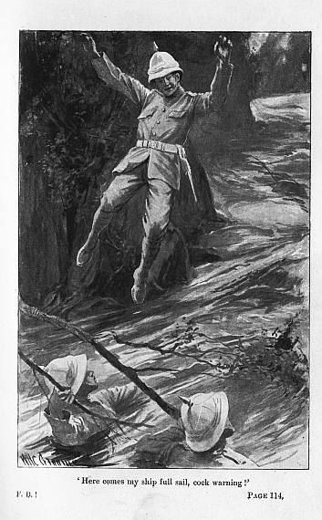 “Yes, sir,” he said, “we’re in a very tight place; and the Colonel here is looking a bit down in the mouth. The little chaps are raging about being kept back, and if he’d let ’em go they’d kill till they couldn’t lift those head-choppers of theirs; but as soon as one’s shot or cut down a dozen seems to spring up, and the place swarms with white-gownds, as if they’d quite made up their minds to kill us to a man before we can get to the fort. There, sir—hear that?”
