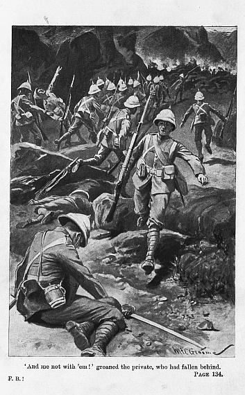 “So as to give old Gee one on the nose, and then have it out with him. I’d make him warm. It’s this sort o’ thing as makes me hate it all. The orficers don’t mind us having a bit of a lark to make the march go light. They takes no notice so long as we’re ready for ’tention and ’ll fight. It’s on’y chaps like Tommy Gee as has got his stripes that comes down upon you. Why, I was singing and doing that plantation song on’y yesterday, and Mr Bracy and Cap’en Roberts come along, and they both laughed. Bet sixpence the Colonel would have looked t’other way.—Oh, I say, ain’t I hungry! Is it much farther?”