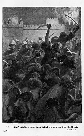 The other burden carried by the brave little Ghoorkhas would not lie, but insisted upon sitting; and somehow, in the midst of the wild excitement of their reception as the heroes who had brought back the help, Gedge seemed to go quite mad with boy-like joy. For as soon as he appeared, bandaged and damaged as he was, Mrs Gee called out his name. A burst of fresh cheering arose then from the men of his company who were near, and as their shouts arose and were echoed by those around, “Bill Gedge! Bill Gedge!” the poor fellow sat up as high as he could upon the little Ghoorkas’ shoulders, threw himself into one of his favourite nigger minstrel attitudes, with left arm outstretched and right hand seeming to thump with all his poor strength upon the imaginary banjo held against his breast.