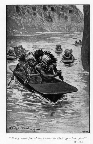 But by the time they were well moving the first of the canoes was very near, and their occupants started their savage yelling again and began to paddle with all their might, till, seeing that the boats were leaving them behind, they dropped their paddles and seized their bows, to let fly a shower of arrows.