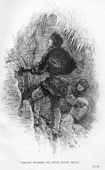 Soon after, the collected embers began to burn, and a faint tongue of flame flickered, danced, went out, and flickered up again, illuminating the darkness sufficiently to let him make out that the banked up snow had largely melted, and that Tregelly had crawled away from where he had lain, and come over to his, Dallas’s, side, apparently to place his heavy bulk as a shelter to keep off the bitter wind from his young companion.