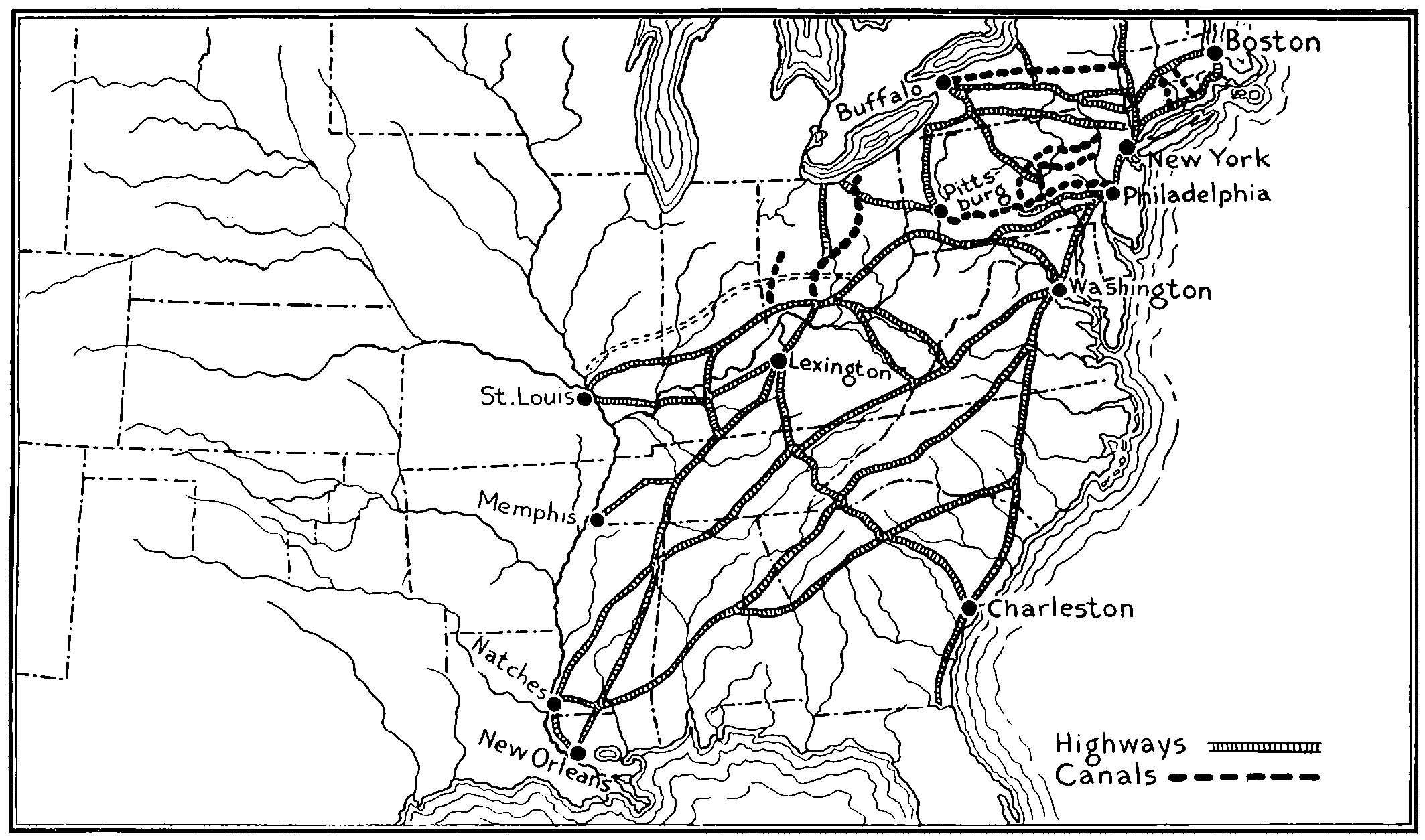 | Showing Main Highways and Waterways in the United States about 1830. When the Railroads Entered the Industrial Arena, the Country Was Being Covered With a Net Work of Highways. (Based on Tanner’s Map of 1825 and Turner in “American Nation,” Vol. XIV.) | ||||