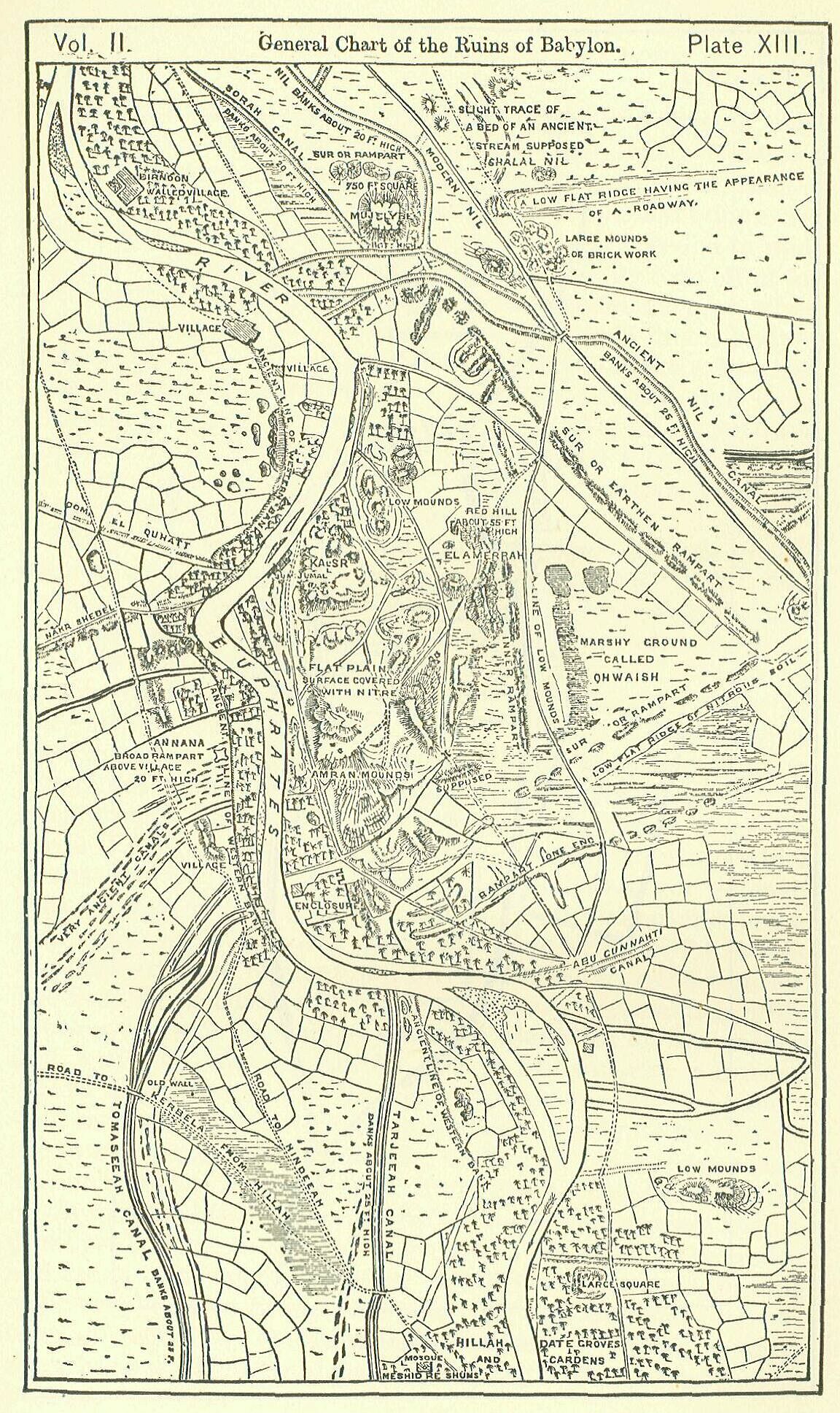 To these constructions may be added, on the authority either of Nebuchadnezzar’s own inscriptions or of the existing remains, the Birs-i-Nimrud, or great temple of Nebo at Bor-sippa; a vast reservoir in Babylon itself, called the Yapur-Shapu; an extensive embankment along the course of the Tigris, near Baghdad; and almost innumerable temples, walls, and other public buildings at Cutha, Sippara, Borsippa, Babylon, Chilmad, Bit-Digla, etc. The indefatigable monarch seems to have either rebuilt, or at least repaired, almost every city and temple throughout the entire country. There are said to be at least a hundred sites in the tract immediately about Babylon, which give evidence, by inscribed bricks bearing his legend, of the marvellous activity and energy of this king.